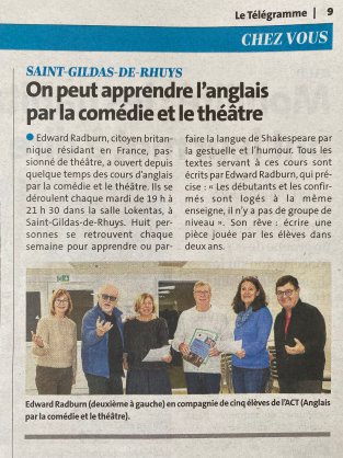 ACT est une nouvelle association née de 28 ans d’expérience d'Eddy Radburn dans les cours d’anglais par le biais du théâtre comique. Elle est installée sur la presqu'île de Rhuys depuis septembre 2025